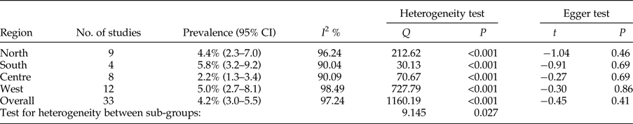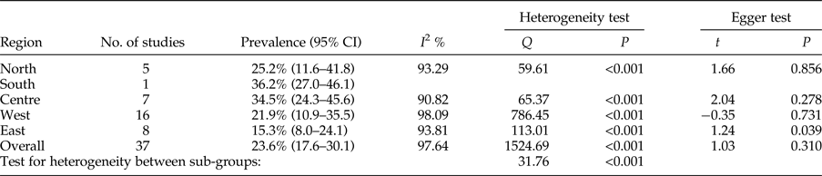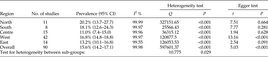 The total prevalence of infection in animal intermediate hosts was assessed as 15.6% (95% CI = 14.2–17.1%). In herbivores, the highest and lowest prevalence rates were observed in the north, 20.2% (95% CI = 13.7–27.7%), and in central Iran, 11.0% (95% CI = 7.4–15.0%), respectively (table 4). Egger's regression test revealed statistically very significant publication bias (P < 0.001) (table 4).