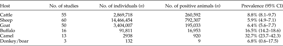 Among 90 records obtained from the literature review, weighted prevalence was evaluated as 15.6% (95% CI = 14.2–17.1%) in animal intermediate hosts. Infection identification was similar to that of definitive hosts, relying mostly upon animal post-mortem inspection in abattoirs (Carmena & Cardona, Reference Carmena and Cardona2013). According to scientific reports in Africa, highest prevalences of hydatidosis in sheep (0.2–68%), goats (0.2–65%) and camels (1.9–61%), were recorded (Bardonnet et al., Reference Bardonnet, Piarroux, Dia, Schneegans, Beurdeley, Godot and Vuitton2002; Njoroge et al., Reference Njoroge, Mbithi, Gathuma, Wachira, Gathura, Magambo and Zeyhle2002; Sissay et al., Reference Sissay, Uggla and Waller2008). In Asia, the greatest rate of infection among production animals was found in sheep intermediate hosts (0.1–82.6%) (Yu et al., Reference Yu, Wang, Wu, Ma, Liu, Liu, Zhao, Morishima and Kawanaka2008; Pednekar et al., Reference Pednekar, Gatne, Thompson and Traub2009); furthermore, among Iran's neighbours, CE prevalence in sheep ranged from 7.5% in Pakistan (Latif et al., Reference Latif, Tanveer, Maqbool, Siddiqi, Kyaw-Tanner and Traub2010) to 64.2% in Kyrgyzstan (Torgerson et al., Reference Torgerson, Ziadinov, Aknazarov, Nurgaziev and Deplazes2009), while cattle and goat infections were 1.8–45.5.% and 5.5–11.1%, respectively (Torgerson et al., Reference Torgerson, Oguljahan, Muminov, Karaeva, Kuttubaev, Aminjanov and Shaikenov2006; Latif et al., Reference Latif, Tanveer, Maqbool, Siddiqi, Kyaw-Tanner and Traub2010; Guo et al., Reference Guo, Kubo, Kudo, Nibe, Horii and Nonaka2011). In Europe, sheep (0–75%), and to a lesser extent cattle (0–41.5%) and goats (0–25.7%), were more involved and are considered to be the main intermediate hosts (Varcasia et al., Reference Varcasia, Canu, Lightowlers, Scala and Garippa2006, Reference Varcasia, Canu, Kogkos, Pipia, Scala, Garippa and Seimenis2007; European Food Safety Authority, 2015). The same situation exists in the Americas (Cardona & Carmena, Reference Cardona and Carmena2013; Carmena & Cardona, Reference Carmena and Cardona2013). Many risk factors may be involved in disease spatial distribution, such as farm hygiene practices and breeding conditions, environmental elements and strain/genotype of hydatid cysts, as well as socio-cultural beliefs (Eckert & Deplazes, Reference Eckert and Deplazes2004). Hydatid infection in livestock not only leads to the need to regulate disposal of infected viscera and dead animals, and to international restrictions on export of infected products, but the infection also detracts from the quality and quantity of livestock products (milk, meat, wool and feathers) and reduces birth rates. Hence, requisite control measures should be taken into account (Torgerson, Reference Torgerson2003).