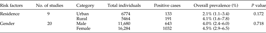 In this section, 33 studies were included (fig. 1 and supplementary table S3). Requisite data were extracted and studies were evaluated in terms of residence and gender risk factors (table 5). More people were infected in rural territories, with a prevalence of 4.1% (95% CI = 1.6–7.8%), than in urban areas. Additionally, mostly females were affected with CE, 4.5% (95% CI = 2.9–6.5%). However, prevalence was not significantly associated with residence or gender (P = 0.172; P = 0.718) (table 5 and supplementary tables S4 and S5).