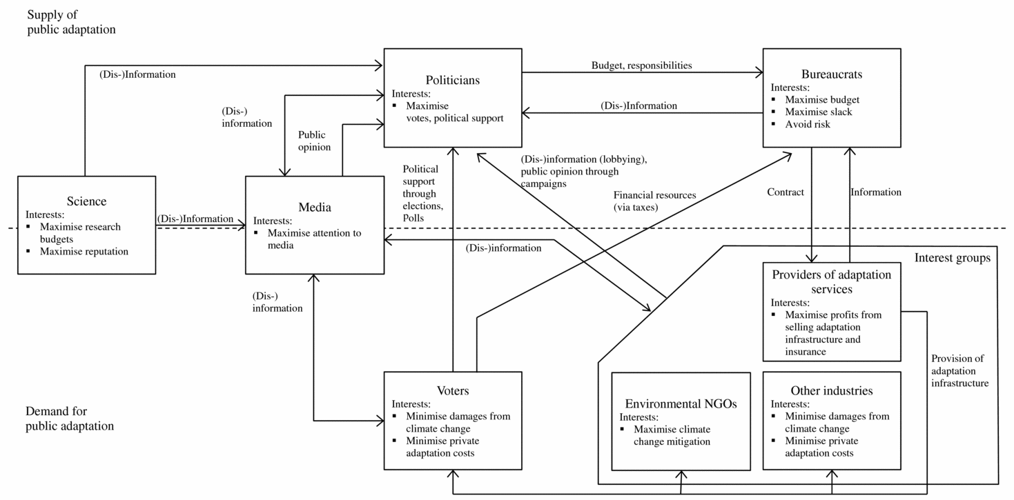 Figure 1. Overview of actors driving public adaptation, their interests as well as relationships between actors.