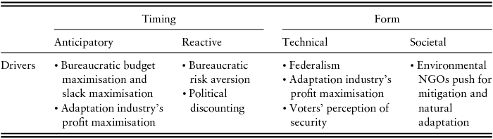 Bureaucracies may favour anticipatory measures because they increase budget in the near future while reactive measures only involve uncertain increases in budget – both with respect to occurrence and point of time. However, budget maximisation and slack maximisation are not tied to specific forms of adaptation (Michaelowa, Reference Michaelowa2001). On the one hand, green and technical adaptation measures typically involve high budgets. On the other hand, societal adaptation is similarly attractive when it can be differentiated in many single measures. If bureaucrats are risk averse, they will favour reactive measures since these grant largely certain benefits while the benefit of anticipatory measures depends on highly uncertain climate change impacts.