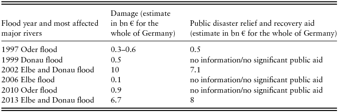Since 1997, Germany has witnessed a number of extreme flood events (see Table 3). In particular, in the Elbe catchment, covering large parts of Northern Czech Republic and Eastern Germany, two extreme flood events occurred within only 11 years, with discharge levels in parts of the main river and some of its tributaries which, statistically, would have to be expected only every 100 years or even less frequently (DKKV, 2013). Damages caused by the Elbe and Danube flood in August 2002 were most severe, with 21 deaths and about 10 bn € financial damage in Germany. Public relief efforts were sizeable. In contrast, when in 2006 the river Elbe also flooded parts of the most affected areas from the 2002 flood in South Eastern Saxony (the overall damage was rather low compared to 2002) no substantial government funds were handed out. In 2013, another extreme flood caused large financial damages at around 6.7 bn € and 8 casualties – because most of the new levees, which were built after 2002, held and the respective cities were not flooded. Furthermore, a recovery aid fund for up to 8 bn € was installed.