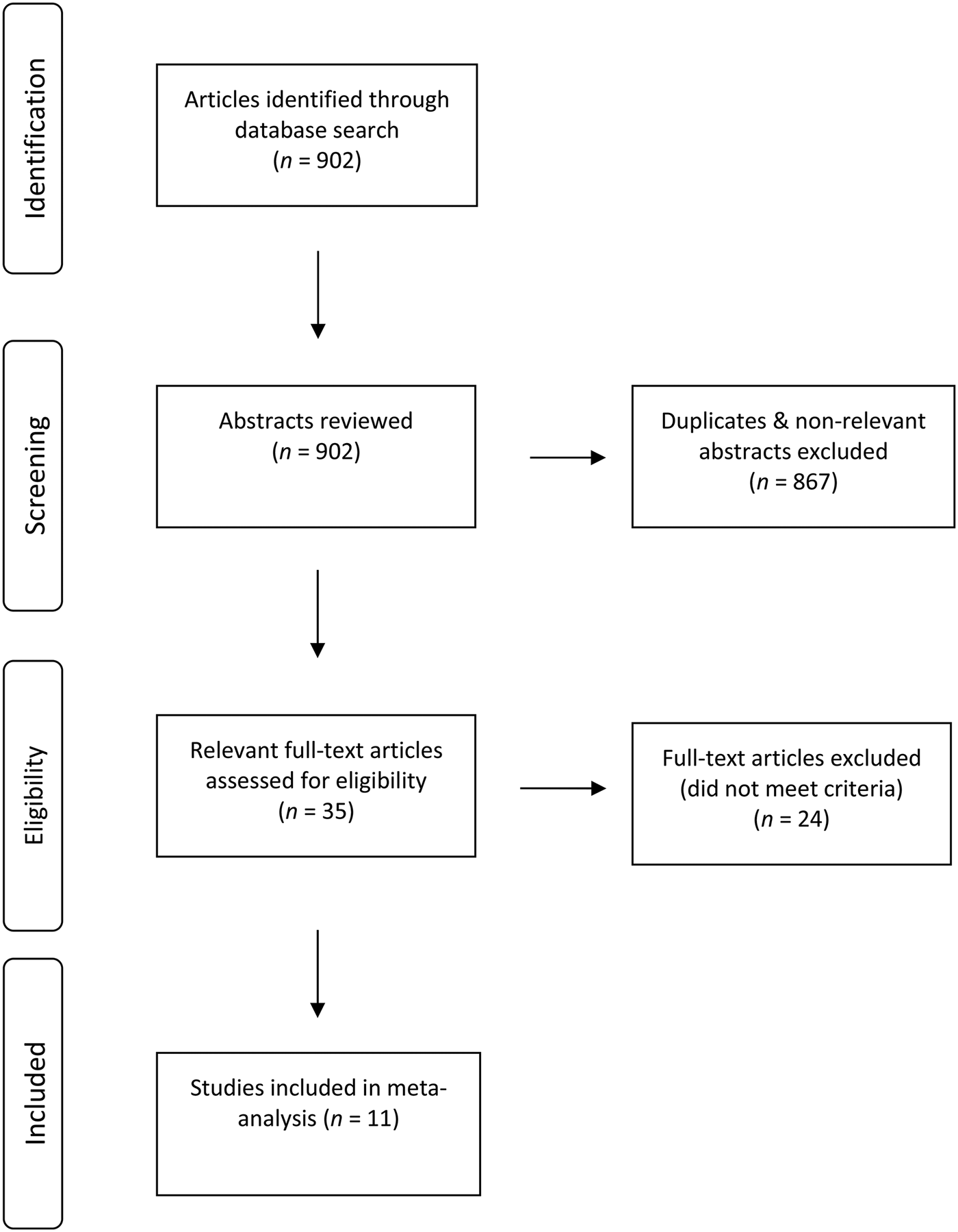 An initial key word search of the listed databases yielded 902 articles in total. After de-duplication and assessment of relevance, 867 articles were excluded. Thirty-five articles were deemed to be relevant. Eleven of these studies, with a total of 937 subjects, met the inclusion and exclusion criteria, and were analysed, as shown in Figure 1.