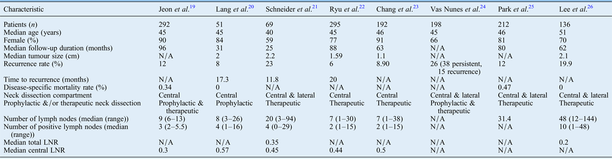 These nine studies were published between 2012 and 2016. All studies were retrospective. Overall, 12 400 papillary thyroid carcinoma patients were included. All patients had undergone thyroidectomy, and: prophylactic or therapeutic neck dissection; central or lateral compartment neck dissection; or both. Median age at the time of diagnosis was 48.6 years, and 76 per cent of patients were female.