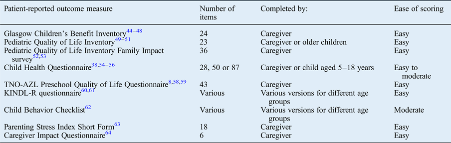 Other generic tools have been used in otolaryngology and are completed by the caregiver, such as the TNO-AZL (Netherlands Organisation for Applied Scientific Research Academic Medical Centre) Preschool Quality of Life Questionnaire (‘TAPQOL’), specifically designed for pre-school children.Reference Kubba, Swan and Gatehouse 8 , Reference Raat, Mohangoo and Grootenhuis 58 , Reference Raat, Botterweck, Landgraf, Hoogeveen and Essink-Bot 59 Several generic tools have been described to specifically assess the impact of a disease on the family or caregiver, such as the Pediatric Quality of Life Inventory Family Impact survey,Reference Varni, Sherman, Burwinkle, Dickinson and Dixon 52 , Reference Blank, Grindler, Schulz, Witsell and Lieu 53 the Parenting Stress Index Short Form (‘PSI-SF’)Reference Davies, Batra, Mehanna and Keogh 63 and the Caregiver Impact Questionnaire (‘CIQ’).Reference Boruk, Lee, Faynzilbert and Rosenfeld 64