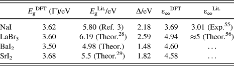 DFT does not provide an accurate description of the electronic structure, since it neglects quasiparticle effects, which manifests itself for instance in the infamous band-gap underestimation. Reference Onida, Reining and Rubio57 In the present work, we need to include quasiparticle effects to accurately describe both band gaps and electronic structure as the foundation of a reliable description of optical properties. Here, we use a scissor operator Δ that shifts all conduction bands to higher energies. The shift Δ is determined using band gaps available in the literature for NaI, LaBr3, and SrI2 (see Table I). For BaI2 we carry out generalized-gradient approximation (GGA) + G 0 W 0 calculations of quasiparticle energies using a Γ-centered 3 × 6 × 3 Monkhorst–Pack Reference Monkhorst and Pack58 (MP) k-point grid and 1024 bands (out of which 54 are occupied) to achieve convergence of the screened interaction. Reference Shishkin and Kresse59 This yields a band gap of 4.98 eV for BaI2 (see Table I).