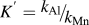 $K^\prime = {\raise0.7ex\hbox{${k_{{\rm{Al}}} }$} \!\mathord{\left/ {\vphantom {{k_{{\rm{Al}}} } {k_{{\rm{Mn}}} }}}\right.\kern-\nulldelimiterspace}\!\lower0.7ex\hbox{${k_{{\rm{Mn}}} }$}}$