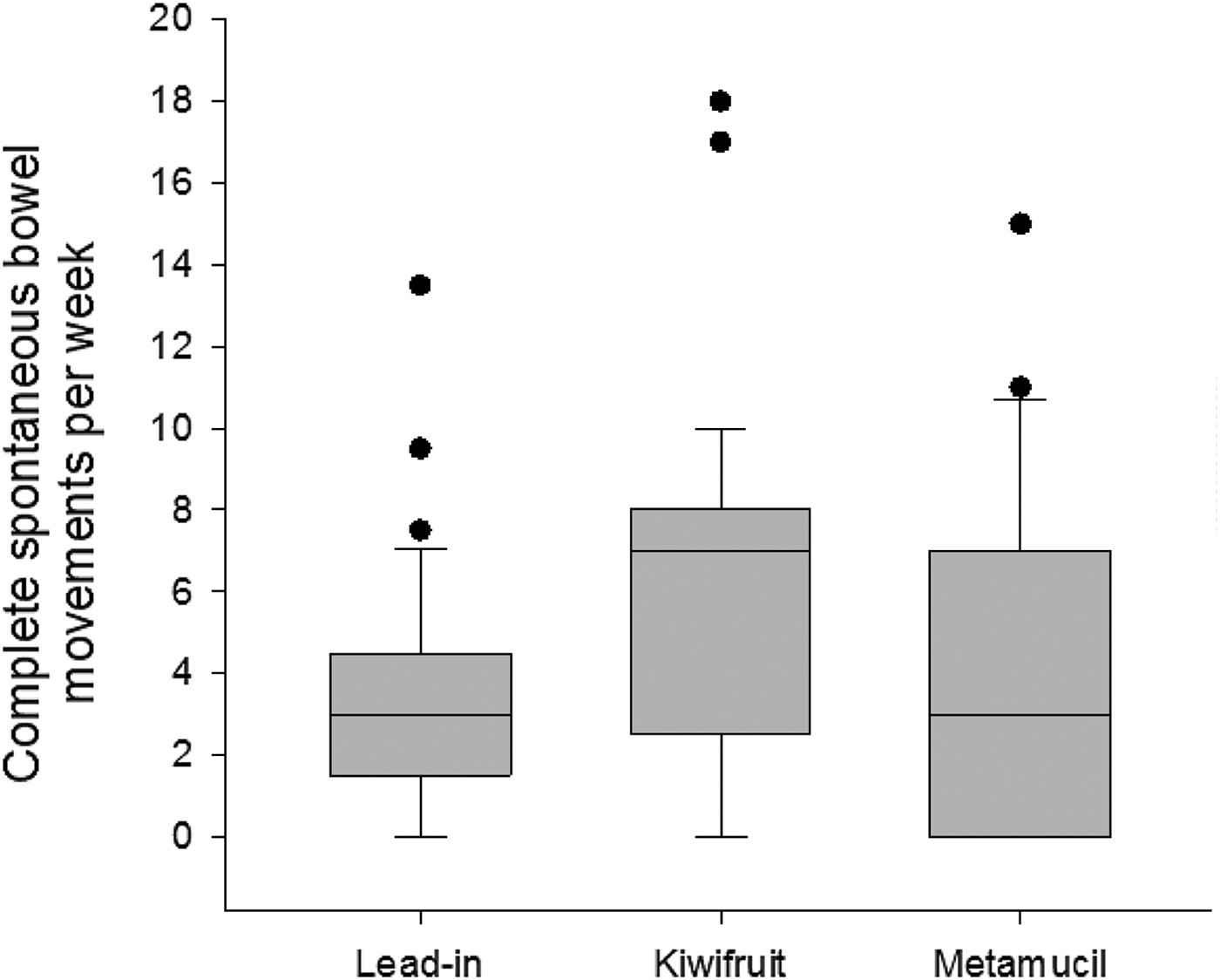 Measurement of CSBM as an indication of bowel function in constipated individuals is a robust and validated measure which takes into consideration the heterogeneous nature of constipation(Reference Attaluri, Donahoe and Valestin12). Sufferers can experience a range of symptoms and feelings, including frequent incomplete bowel movements with hard stools requiring an excessive amount of straining, which can be misleading when assessing bowel function accurately. An increase of greater than one CSBM per week is considered a clinically significant marker of improved bowel function in symptomatic individuals(Reference Johanson, Wald and Tougas23). This trial is the first randomised controlled single-blinded study examining the effect of ‘Zesy002’ kiwifruit in mildly constipated adults, and provides preliminary evidence that the consumption of three ‘Zesy002’ kiwifruit daily can be considered as a treatment for constipation alongside recognised treatments such as Metamucil® and its efficacy should be investigated further.