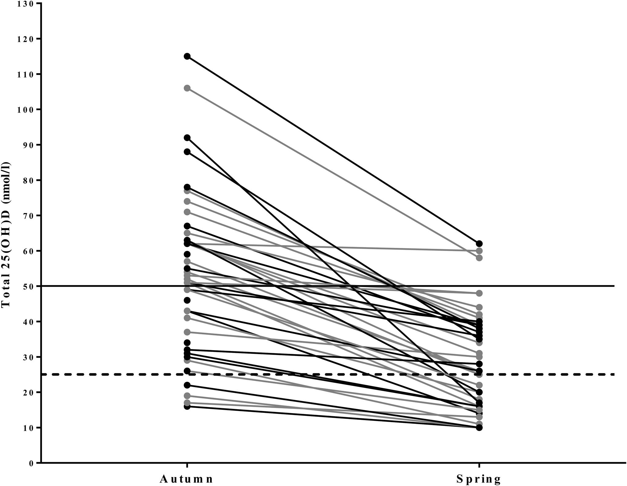 Fig. 2. Line graph illustrating the individual variation of 25-hydroxyvitamin D (25(OH)D) concentrations in university-level athletes assessed in autumn (n 47) and spring (n 47). 25(OH)D statuses of <25 nmol/l are considered deficient (----). 25(OH)D statuses of >50 nmol/l are considered sufficient (–––). ●, Indoor athletes; ●, outdoor athletes.