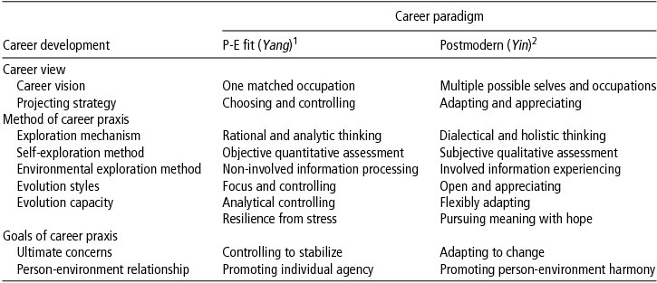 Table 1 denotes the characteristics of two career paradigms in terms of career view and praxis (Liu, S. et al., Reference Liu, Hung, Huang, Wang and Peng2015; Liu, S., & Wang, Reference Liu and Wang2014; Liu, S. et al., Reference Liu, Chen, Lu, Lu and Ching2014). The P-E fit paradigm considers a matched job as the ideal career development and prefers rational strategies to achieve job security. Such an approach considers career uncertainty as something bad and tries to remove it by choosing and controlling. Western postmodern career theories valued openness and appreciated multiple possible selves and occupations as ideal career visions. They consider career uncertainty as something good and try to capitalise on it by appreciating and adapting. Strategies of choosing and controlling emphasise rational and analytic thinking to capture a precise understanding of self and environment, utilising quantitative assessment results and factual career information. Strategies of appreciating and adapting, on the other hand, emphasise dialectical and holistic thinking to obtain experiential understanding of self and environment by immersing into narratives or artistic creation. While modernism focuses on yang only and postmodern stresses yin much more than yang, our VEC model values both yang and yin.