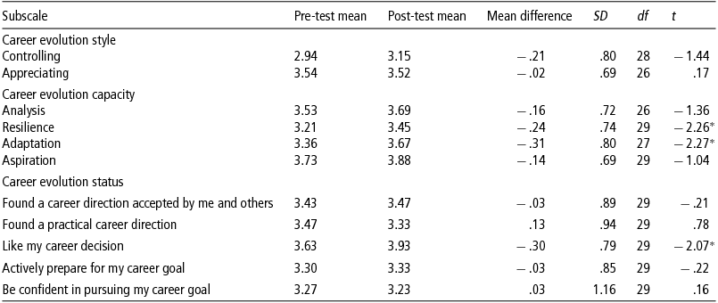 According to t test results in Table 4, the immediate impacts of the VEC career classes included significant improvement of resilience, adaptation and liking of career decisions reported by the students. Given that the three class periods were only 135 minutes in total, such a result was impressive. It showed that a yin-yang-blending career guidance course might empower students to handle career uncertainty, challenges and difficulties, as well as achieve harmony in situations of complexity and conflict. More importantly, students reported that by exploring objective and subjective occupational information using the CCN Occupational Interest Inventory, and practising both yin and yang career strategies and career development capacities, they felt more positive about their career decisions.