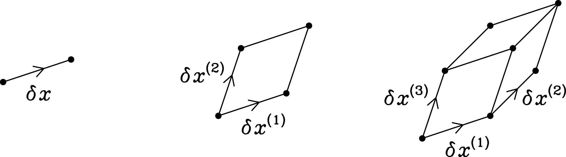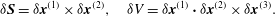 $$\begin{eqnarray}{\it\delta}\boldsymbol{S}={\it\delta}\boldsymbol{x}^{(1)}\times {\it\delta}\boldsymbol{x}^{(2)},\quad {\it\delta}V={\it\delta}\boldsymbol{x}^{(1)}\boldsymbol{\cdot }{\it\delta}\boldsymbol{x}^{(2)}\times {\it\delta}\boldsymbol{x}^{(3)}.\end{eqnarray}$$