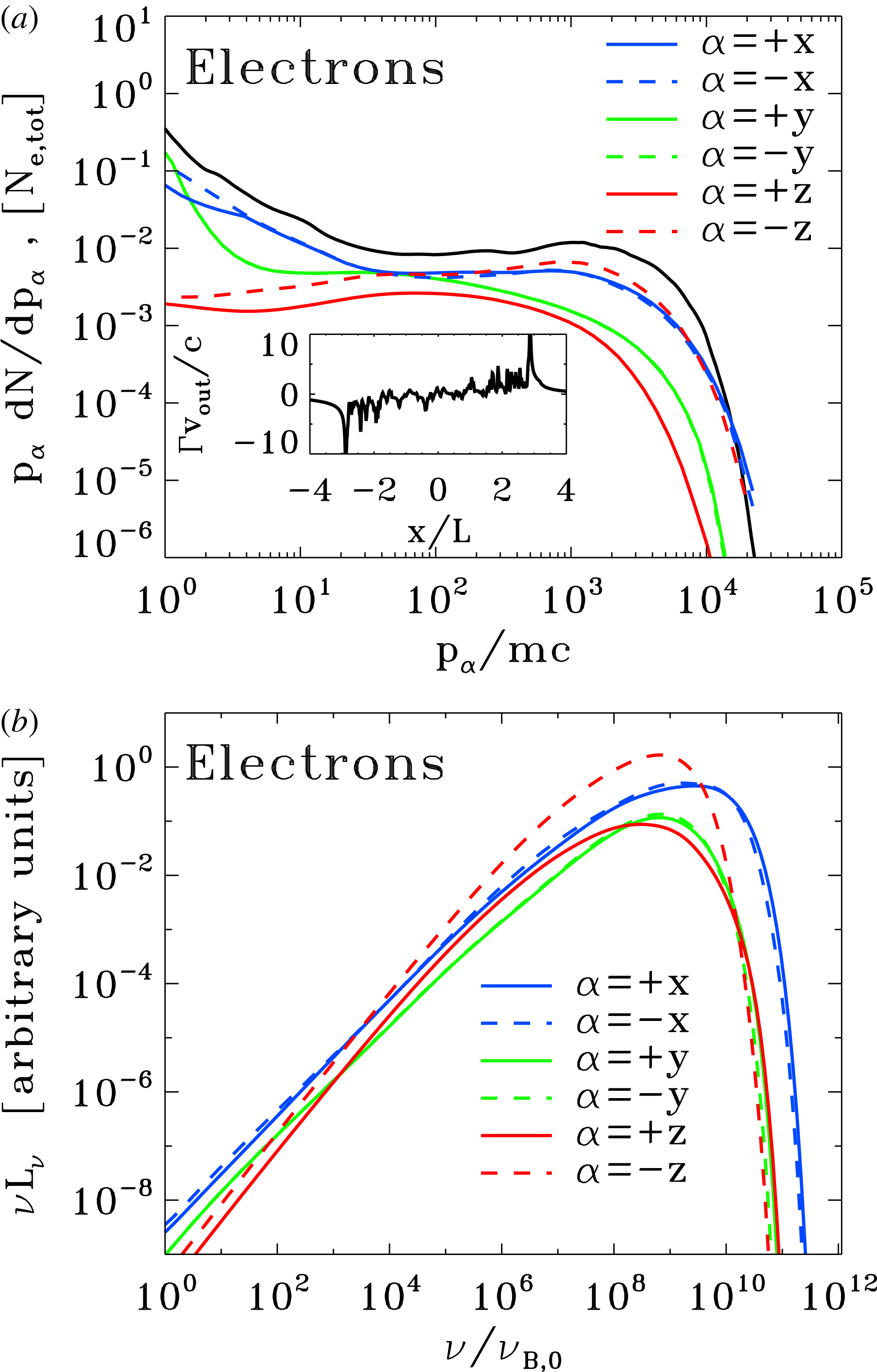 ), as indicated in the legend. The resulting anisotropy of the synchrotron emission is consistent with the particle anisotropy illustrated in figure 16(a). In addition, one can see that the resulting synchrotron spectrum along the direction
