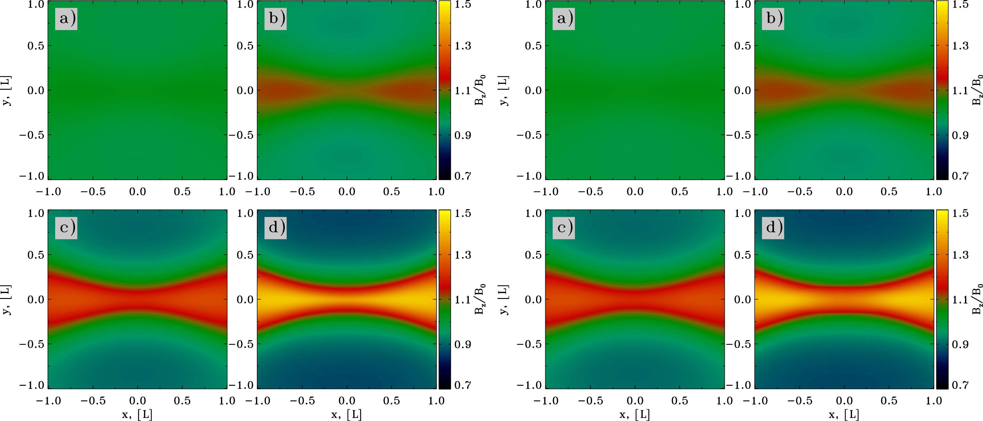 from the origin. When uniformly squeezed, such an X-point is known to be unstable to collapse in the non-relativistic regime (Dungey Reference Dungey1953; Imshennik & Syrovatskiǐ Reference Imshennik and Syrovatskiǐ1967; Priest & Forbes Reference Priest and Forbes2000). In the force-free limit, such a solution develops a singularity from the start, unless we introduce a guide field. For simplicity, here we consider a uniform guide field