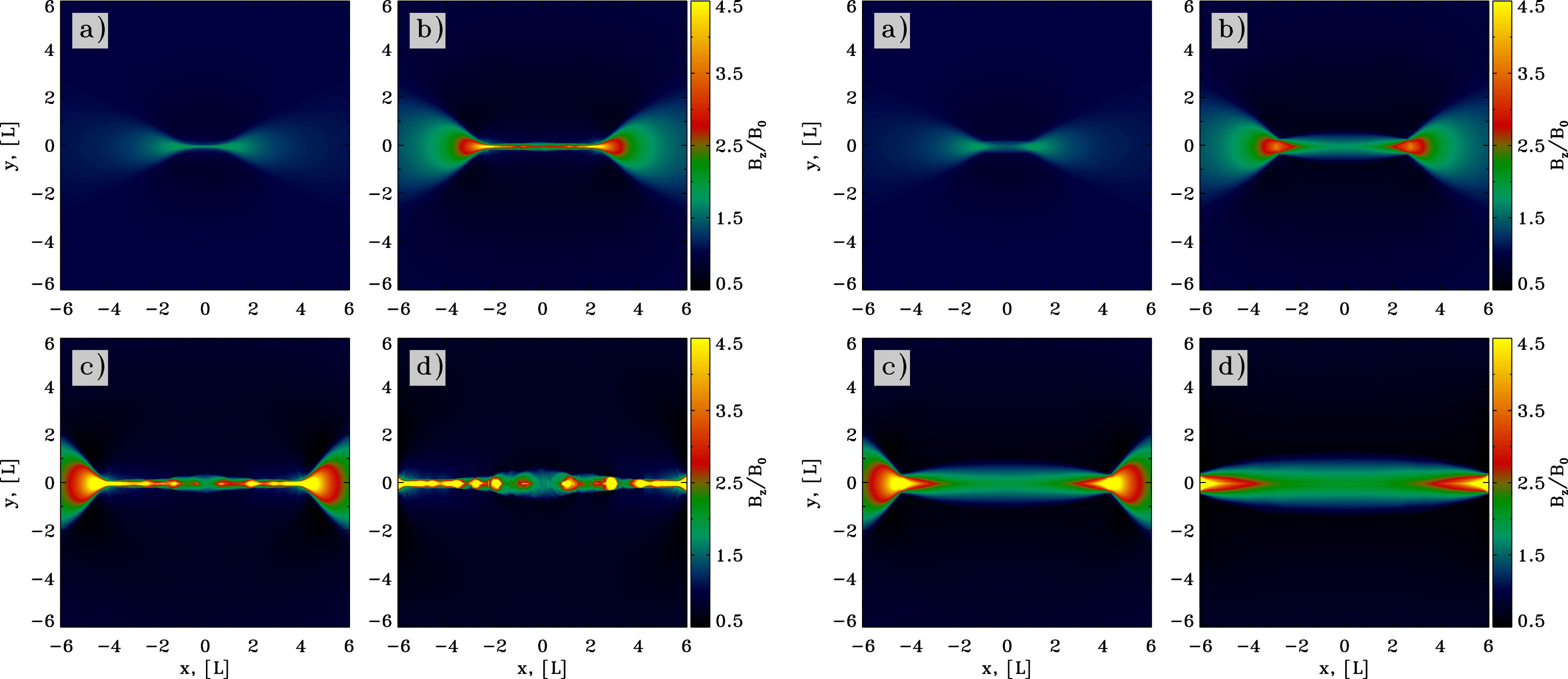 Figure 18. Stability of the X-point to small-scale perturbations in force-free simulations. (a) Shows the