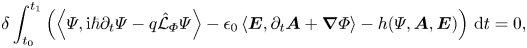 and computing $\langle {\mathcal {J}}(\varPsi ,{\boldsymbol {A}},{\boldsymbol {E}}),\xi \rangle =-\epsilon _0\langle {\boldsymbol {E}},\boldsymbol {\nabla }\xi \rangle -q\langle \varPsi ,\hat {{\mathcal {L}}}_{\xi }\varPsi \rangle$