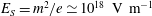 $E_{S}=m^{2}/e\simeq 10^{18}~\text{V}~\text{m}^{-1}$