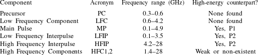 find a very different profile from that seen at lower radio frequencies. We show the radio evolution of the mean profile, with components labelled, in figure 1, and summarize the components in table 2.