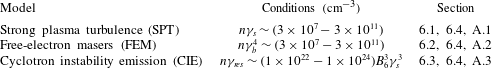 In addition, both of these models assume the existence of an initial radio beam that can be amplified by stimulated scattering. The origin of the beam is not discussed. In that sense, neither of these models addresses the primary radio emission mechanism. Given the many uncertainties, neither model can easily be compared to radio data. We do not pursue these any further.