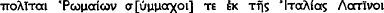 Compare the clause from an SC about Ambracia in 187 B.C. (Livy XXXVIII, 44, 4): ‘portoria … caperent dum eorum immunes Romani ac socii Latini nominis essent.’ Similarly in 180 B.C. the praetor Duronius (Livy XL, 42, 4) ‘adiecit multis civibus Romanis et sociis Latini nominis iniurias factas in regno eius (sc. Gentii)’.