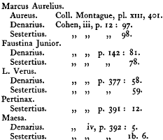 page 152 note 1 Mr. G. F. Hill (to whom I am indebted for the selection of the coins in fig. 37, and for the casts taken from specimens in the British Museum) informs me that these imperial pyres with torches first appear on ‘consecratio’ coins (aurei, denarii, sestertii) of the Antonine period, and that, though the type of the pyre can be traced down to Constantius Chlorus, the coins of Maesa seem to be the latest on which the torches figure. He gives the following list (made under the present somewhat limited conditions of investigation) of coins on which they occur:
