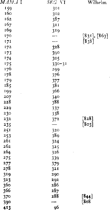 2 A considerable literature has already sprung up round the evidence of MAMA I, the gist of which (most of it the work of Wilhelm, Peek or Grégoire) has been incorporated by Hondius in SEG VI. The following concordance-list, which includes page-references to Wilhelm's subsequent work inhis Griechische Grabinschriften aus Kleinasien, may be of service to students of MAMA I:—
