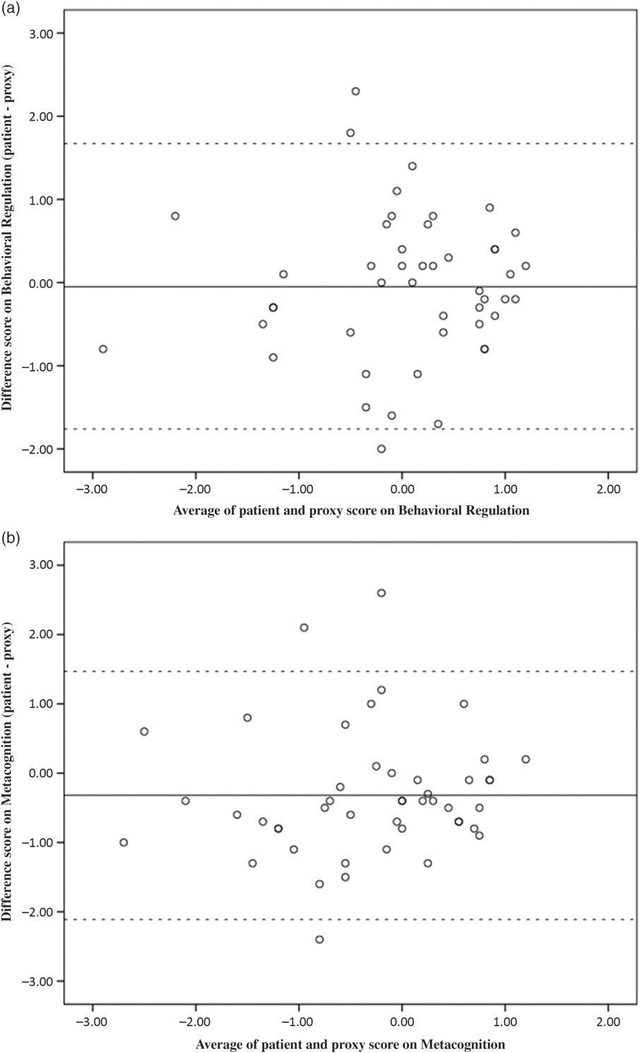 Regarding the degree of concordance as measured with Lin’s CCCs, the findings indicate moderate to substantial agreement among dyads on patients’ EF, with CCCs of 0.61 and 0.57 for the Behavioral Regulation Index and Metacognition Index. Based on these CCCs, we can conclude that proxy-reports are a reasonable estimate of patient-reported EF. The additional information from the Bland–Altman plots and cross tables suggests less agreement between patients and proxies on the Metacognition Index compared with the Behavioral Regulation Index. This can also be explained by the more concrete and observable symptoms assessed by the Behavioral Regulation Index, as described above.