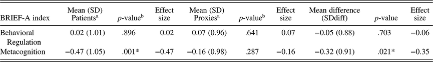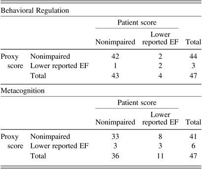 When comparing mean patient scores with mean proxy scores using paired-sample t-tests (Table 1), a significant mean difference was observed on the Metacognition Index. Patients reported significantly lower EF (i.e., more concerns) than their proxies (t(46) = −2.40, p = .021, Cohen’s d = −0.35), with Cohen’s d indicating a small effect. On the Behavioral Regulation Index, no significant mean difference was observed between patients and proxies (t(46) = −0.83, p = .703, Cohen’s d = −0.06).