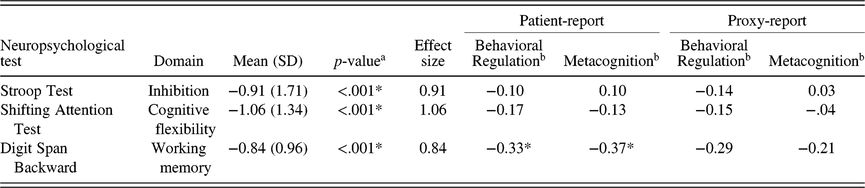 Correlation coefficients of neuropsychological tests scores with patient-report and proxy-report are listed in Table 4. Overall, nonsignificant very small correlations were observed, with r ranging from −0.29 to 0.10, except for Digit Span Backward, where significant negative correlations were observed with patient-report of EF (r of −0.33 and −0.37 for Behavioral Regulation and Metacognition, respectively).