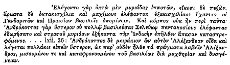 ii. § 1. Biduum apud eum substitit rex: tertio die amnem superare decreverat, transitu difficilem, non spatio solum aquarum, sed etiam saxis impeditum. 2. Percontatus igitur Phegea, quæ noscenda erant, ‘xi dierum ultra flumen per vastas solitudines iter esse’ cognoscit: ‘excipere deinde Gangen, maximum totius Indiæ fluminum: 3. ulteriorem ripam colere gentes Gangaridas et Pharrasios; eorumque regem csse Aggrammem, xx millibus equitum ducentisque peditum obsidentem vias: 4. ad hæc quadrigarum duo millia trahere et præcipuum terrorem elephantos, quos trium millium numerum explere’ dicebat. [Five variants of the name are given, Agramen, Agrammem, Agrame, Agramen, Aggramem.] 5. Incredibilia regi omnia videbantur: igitur Porum (nam cum eo erat) percontatur, ‘an vera essent, quæ dicerentur?’ 6. Ille ‘vires quidem gentis et regni haud falso jactari’ affirmat; ‘ceterum, qui regnaret, non modo ignobilem esse, sed etiam ultimæ sortis: quippe patrem ejus tonsorem vix diurno quæstu propulsantem famem, propter habitum haud indecorum, cordi fuisse reginæ: 7. ab ea in propiorem ejus, qui tum regnasset, amicitiæ locum admotum, interfecto eo per insidias, sub specie tutelæ liberum ejus invasisse regnum; necatisque pueris hunc, qui nunc regnat, generasse, invisum vilemque popularibus, magis paternæ fortunæ, quam suæ memorem.’—Quintus Curtius, ed. Delph, . London, 1825, vol. ii. 676.Google Scholar