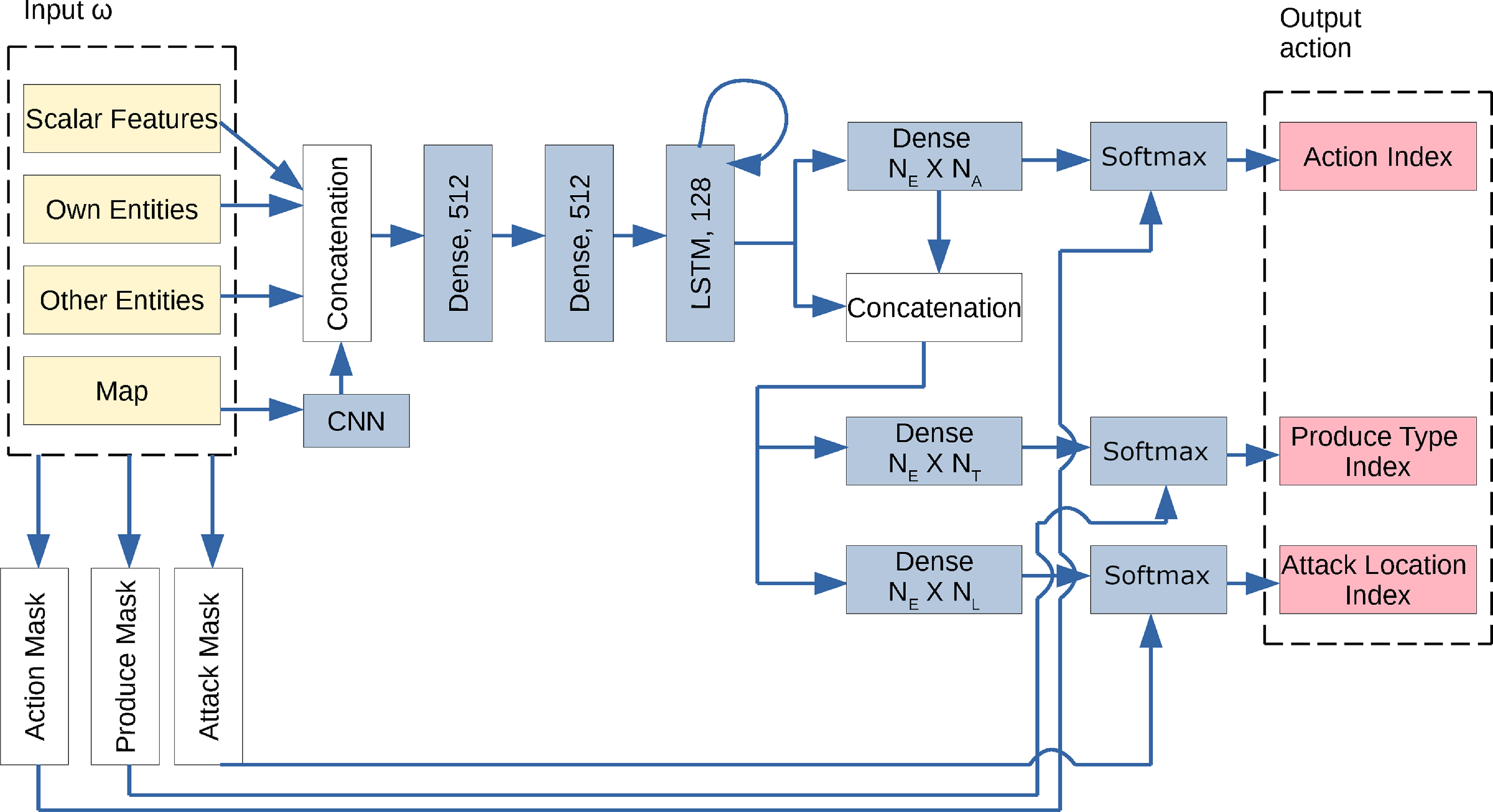 pruning technique for durative actions for fast heuristic search in RTS combat. Chung et al. (Reference Chung, Buro and Schaeffer2005) applied Monte Carlo planning to a version of Open RTS (ORTS). Balla and Fern (Reference Balla and Fern2009) applied the well-known Monte Carlo Tree Search algorithm based on upper confidence bounds, called UCT, to tactical assault planning in Wargus. More recently, Critch and Churchill (Reference Critch and Churchill2020) used influence maps to plan navigation that maintains safe distance from enemy units and scouts. To reduce the search space to a manageable size, most of these techniques rely on abstraction in state and action spaces. Our RL-based approach performs many of these tasks differently, and does not rely on additional abstractions than what is provided by the game. For instance, spatial reasoning and planning are accommodated via convolutional neural network (CNN) and recurrence in our actor model. While state estimation is obviated by the observation of hidden state during training, our specialized exploration of RLaR also favors policies that minimize state ambiguity during the execution of trained policies when the hidden state is no longer available.