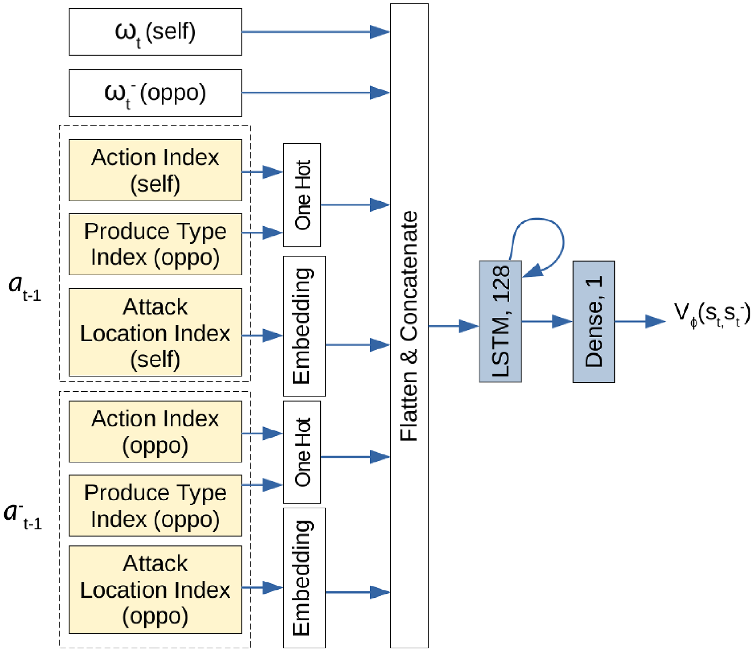 for a draw (i.e., when a game does not complete within 3000 steps), where score is the learner’s MicroRTS assigned terminal score that reflects the strength/weakness of its final position in the absence of a clear winner. 50 bonus points are added for drawn games in order avoid 0 returns for the entire trajectory when