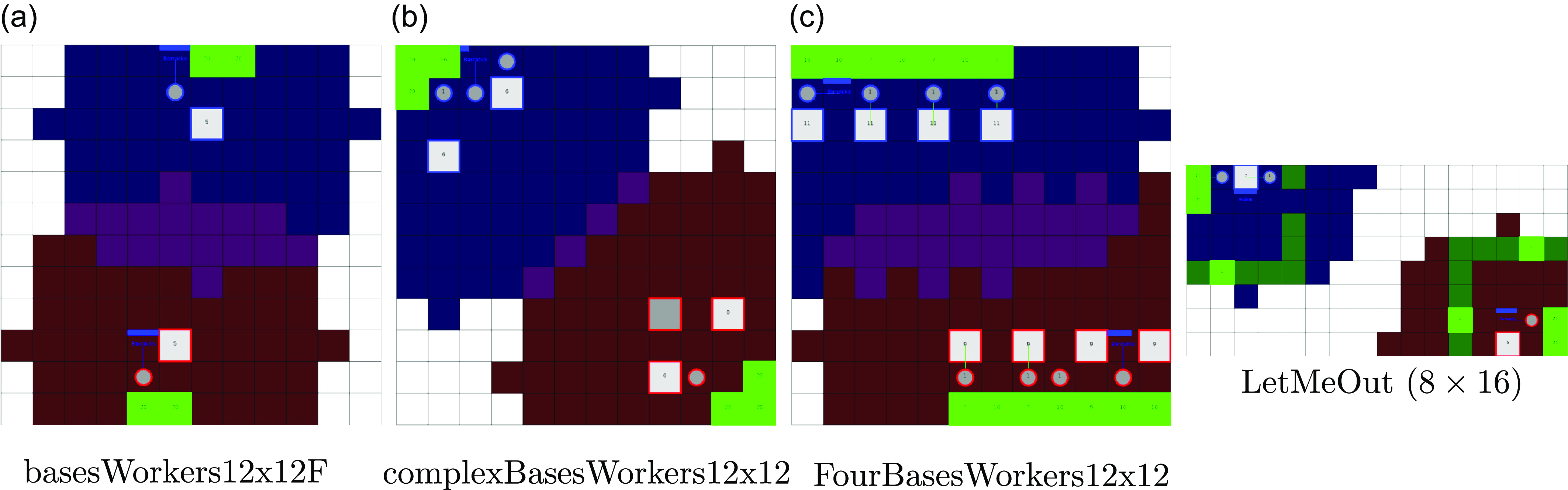 We experiment with the three methods discussed in Section 4, viz., baseline RL, RLAlpha, and RLaR. For baseline RL, we use the advantage actor-critic (A2C) algorithm described in Section 3.1, modified with self-imitation learning (Oh et al., Reference Oh, Guo, Singh and Lee2018), A2C+SIL. Both RLAlpha and RLaR are built on top of A2C+SIL, thus sharing this common baseline. We train each variant in four different maps, shown in Figure 4. We selected these maps to incorporate variety of difficulty. For instance, the map ‘basesWorkers12x12F’ (Figure 4(a)) has the resources (bright green cells) in (relatively) opposite and non-corner locations, compared to other maps. The map ‘FourBasesWorkers12x12’ (Figure 4(c)) contains more initial bases and resources than other maps. Finally, the map ‘LetMeOut’ (Figure 4(d)) has a very different layout than other maps, where the players are walled (dark green cells) off, with doorways initially blocked by resources (although the blue agent had cleared one doorway by the time the screenshot was taken).