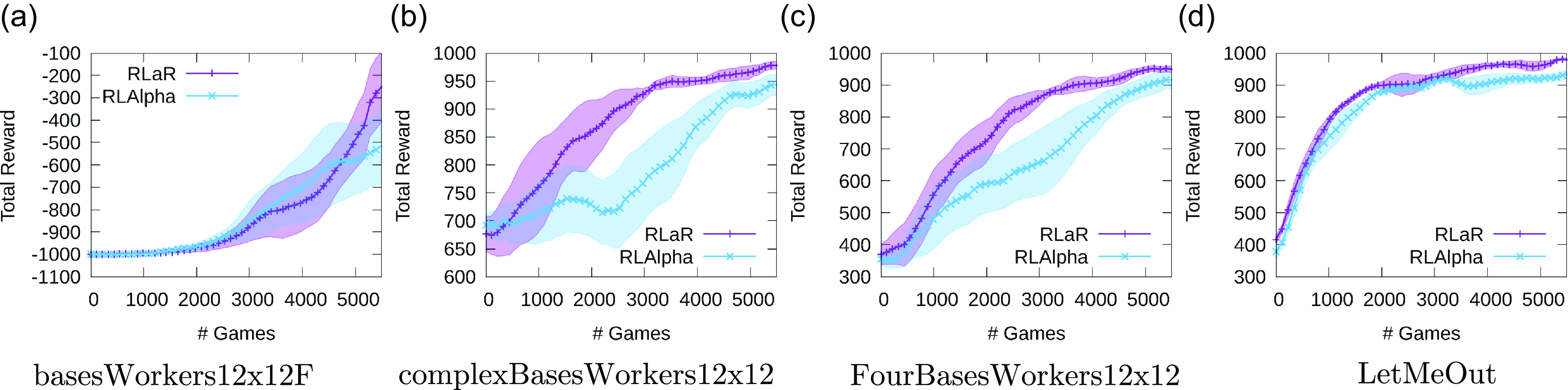 Figure 5. Learning curves of RLAlpha (RLAlpha+A2C+SIL) and RLaR (RLaR+A2C+SIL) against MicroPhantom in 4 maps. Baseline RL (A2C+SIL) is excluded due to poor performance. The terminal reward for win/loss/draw are +1000/–1000/+50. The initial policy/actor was trained by supervised learning from games between MentalSeal and MicroPhantom on large set of maps, but performs poorly in (a).