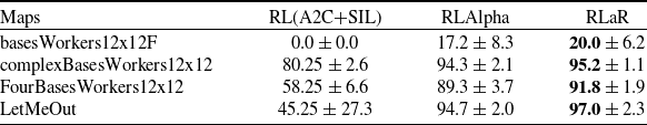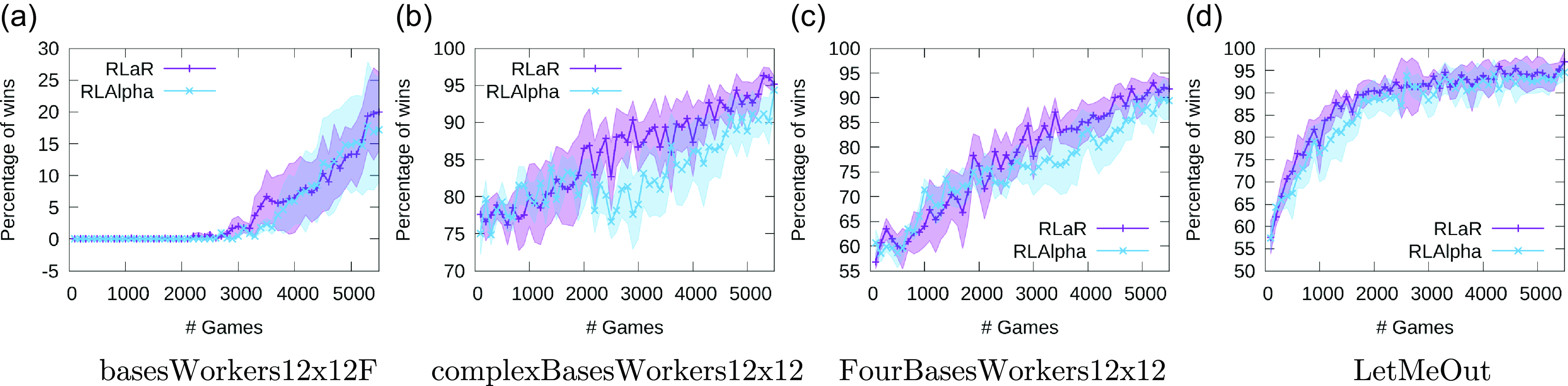 We also evaluate the learning performance using a second measure. We save the learned policies during training at intervals of 100 games, and later run each policy against MicroPhantom for 100 independent trials/games. We show the percentage of wins for the learned policies, averaged over 100 evaluation trials and 6 learning trials in Figure 6. Note that while Figure 5 uses data from every training game and exponential moving averages to achieve smoothness, data is sparse (only available every 100 games) for Figure 6. Due to this lack of data between plot points, the curves in Figure 6 are noticeably less smooth, but they follow roughly the same trends as Figure 5. However, a closer comparison of the trends in the two figures reveals that the difference between RLaR and RLAlpha is less accentuated in Figure 6 not because of the overperformance of RLAlpha but because of the underperformance of RLaR by this measure. This leads us to the following conclusion: in the games that are drawn and discounted in Figure 6, RLaR must be achieving terminal positional advantages relative to MicroPhantom—something that is, in fact, rewarded by the native game score and included in Figure 5—because score can be a large negative number for an inferior terminal position. This observation appears to especially hold in the maps complexBasesWorkers12x12 and FourBasesWorkers12x12.