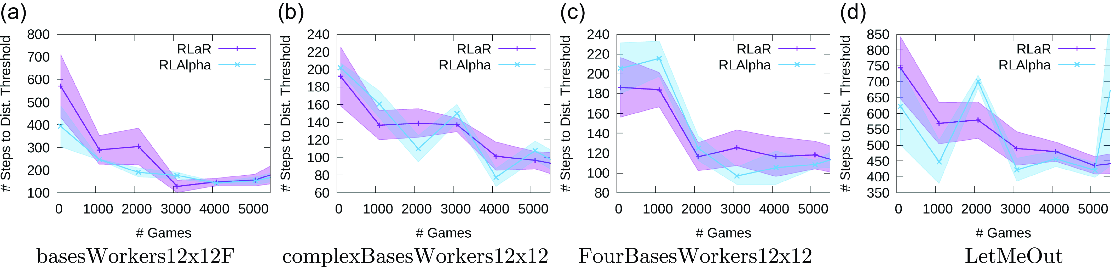 In order to further evaluate the impact of RLaR’s characteristic exploration, we conduct a second experiment. In this experiment, we note the number of steps in a game that it takes the learner to get close enough to the opponent’s base, that is, for any of its units to get within a distance threshold of the opponent’s base. When there are multiple opponent bases, we take the centroid of their locations. This can be viewed as a rough measure of how quickly the learner deploys spies. The results are shown in Figure 7 for a distance threshold of 4.0–sufficient to bring it within the observable radius. The first observation is that this measure does not correlate accurately with learning performance (Figure 5), as early spying can end in failure while late spying can still end in victory. Neither is it a measure of the effectiveness of spying, as observing the opponent’s base does not mean all of the opponent’s units are also visible. However, another observation from Figure 7 is that while the trend is expected to be decreasing with continued learning, this does not occur reliably with RLAlpha. Particularly in Figure 7(b) and (d), we notice spikes where the learner appears to be regressing in terms of this measure. RLaR, by contrast, achieves a steadier acceleration toward proximity. As proximity is a reliable predictor of the opponent’s observation in MicroRTS, we speculate that this is a direct result of RLaR’s use of predictor-based exploration.