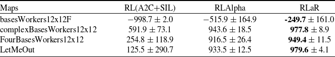 The learning curves corresponding to the 4 maps are shown in Figure 5, over a series of 5500 games. Each curve is averaged over 6 independent trials, with half standard deviation bands shown in corresponding colors. The initial policy/actor for all versions were trained by supervised learning from a set of games played between MicroPhantom and MentalSeal. This results in positive initial performance of all variants, as seen in Figures 5(b–d), although the trained initial policy was practically useless in (a). The learning curves demonstrate a superior learning rate for RLaR, and also serve as an ablation for the predictor network as that is the only difference between RLAlpha and RLaR. Also note that a total reward approaching +1000 indicates that the agent has learned to almost always defeat MicroPhantom. Videos of trained RLaR policy against MicroPhantom are posted at https://tinyurl.com/y3xhb9nt.