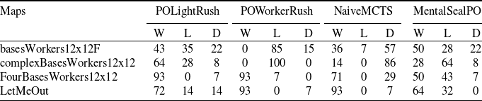 Table 4. Win(W)/Loss(L)/Draw(D) percentages of the best RLaR policy against 4 scripted opponents in 4 maps over 100 games