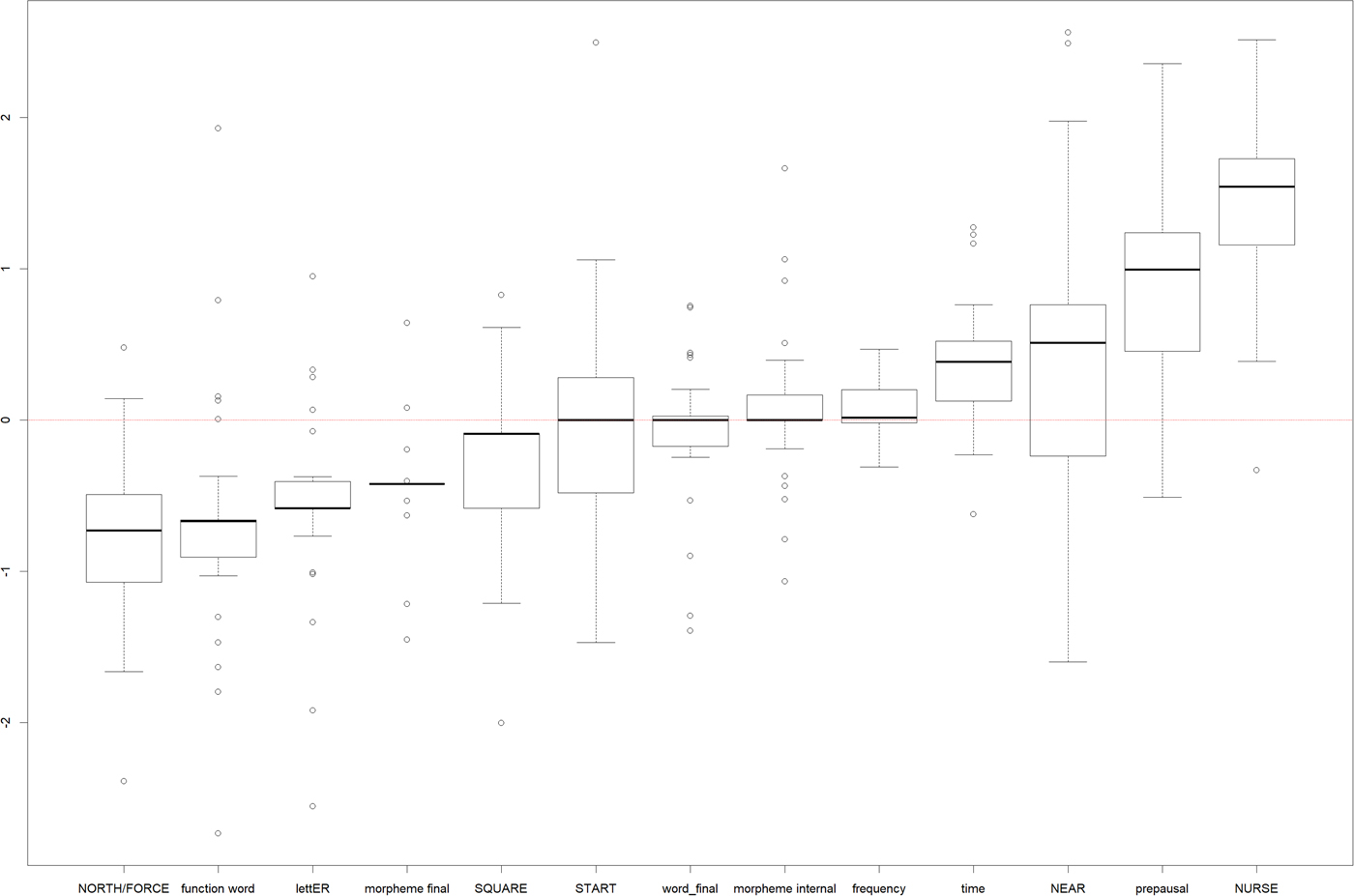 Figure 11 visualizes the ranges of coefficients across speakers. In summary, we can say that the following relatively consistently favor rhoticity: