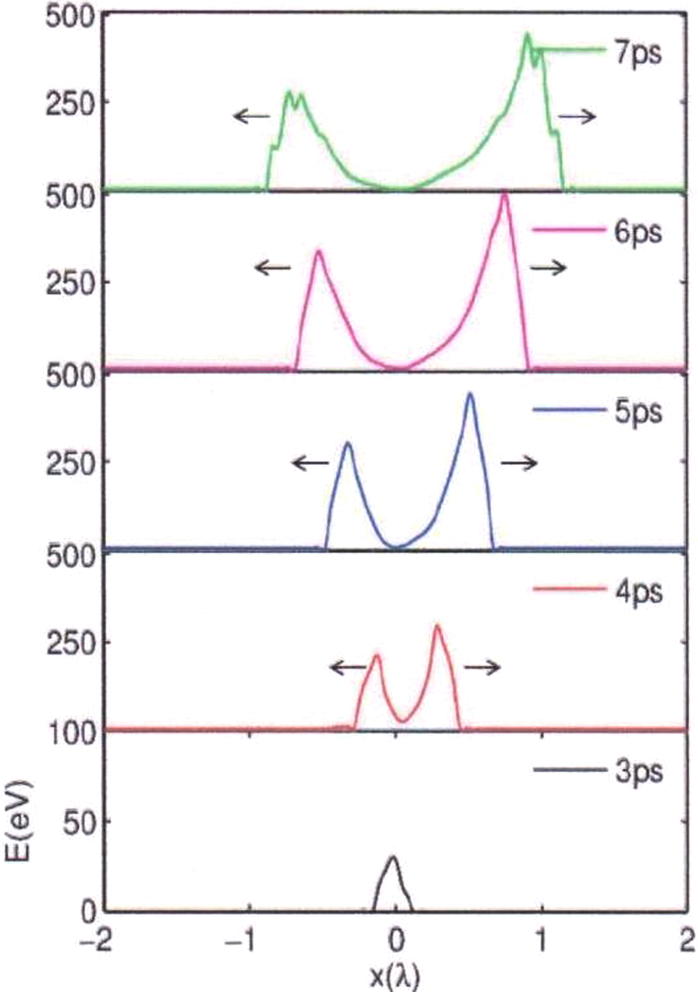 Fig. 5. PIC computation of the dielectric explosion of the plasma blocks at plasma densities close to the critical density (Hora et al., Reference Hora, Eliezer, Wang, Korn, Nissim, Xu, Lalousis, Kirchhoff and Miley2018) confirming of the result of hydrodynamic computations (Fig. 1) as necessary process for the very rare measurement of the blue Doppler shift in the reflected light (Sauerbrey, Reference Sauerbrey1996; Zhang et al., Reference Zhang, He, Chen, Li, Zhang, Wang, Feng, Zhang, Tang and Zhang1998; Hora, Reference Hora1969, Reference Hora1981).