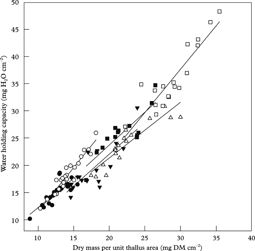 Fig. 6. Specific thallus mass (mg dry matter cm–2) and water-holding capacity (mg H2O cm–2) in fully hydrated thalli after removing surface water by blotting. All fruticose epiphytic lichen species found in an Atlantic oak forest in Spindanger, Farsund, south-western Norway were included. •, Evernia prunastri; ○, Pseudevernia furfuracea, ▼, Ramalina farinacea; △, Usnea cornuta; ▪, Usnea subfloridana; □, Sphaerophorus globosus; species specific regression lines are shown. Thallus area in E. prunastri, P. furfuracea, R. farinacea and S. globosus was measured with a LI3100 Licor Area Meter (Lincoln, Nebraska, USA); areas in the two Usnea spp. were computed by imaging tools (ImageJ 1.46f version). In all species, a range of thallus sizes as measured (original data)