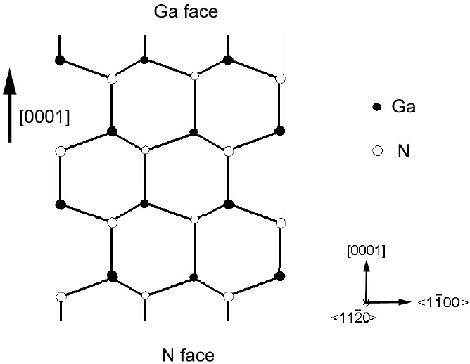 The most common growth direction for GaN is normal to the {0001} basal plane. The basal plane has a polar configuration with two atomic sub-planes each consisting of either the cationic or the anionic element of the binary compound. Thus, in the case of GaN a basal plane surface should be either Ga or N terminated (See Fig.1). Note that the polarity is a bulk property. The identification of the polarity in GaN can be carried out by several techniques such as X-ray photoemission spectroscopy [Reference Sasaki and Matsuoka3], convergent beam electron diffraction [Reference Liliental-Weber, Washburn, Pakula and Baranowski4,Reference Ponce, Bour, Young, Saunders and Steeds5,Reference Vermaut, Ruterana and Nouet6], and chemical etching [Reference Weyher, Müller, Grzegory and Porowski7]. For a review of GaN polarity determination, see ref. [Reference Hellman8]. In this paper we report on CBED studies of LEO GaN on Si(111) substrate and show that the polarity is Ga face.