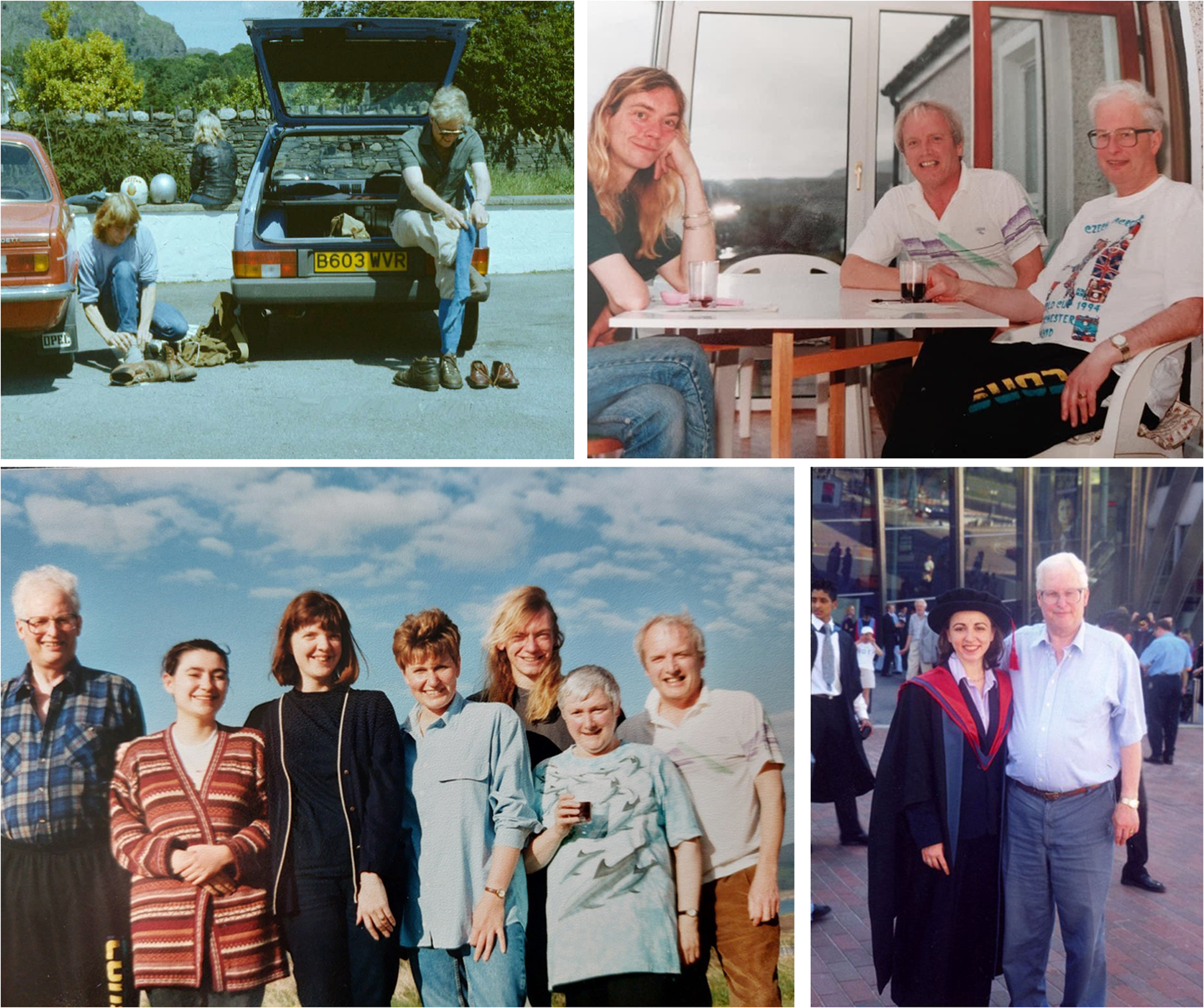 Top left: Craig Williams and Alan on a trip to the Peak District in 1984 (Photo courtesy of Jörg Kärger). Top right: Craig Williams, Bob Mooney and Alan relaxing after zeolite hunting on Skye 1996 (Photo courtesy Sue Hill). Lower left: Alan, Martina Gibbons, Sue Hill, Kay Latham, Craig Williams, Oneta Wilson and Bob Mooney (Photo: Sue Hill). Lower right: Alan and Lina AL Attar at Lina's Graduation Ceremony (15 July 2003).