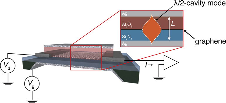 A schematic and cross section (inset) of the graphene transistor in an optical cavity. The separation L of the silver mirrors determines the resonant wavelength λ of the cavity, for which the intensity profile of the λ/2 mode is shown in orange; V g, gate voltage; V d, drain voltage. Reproduced with permission from Nat. Commun. 3 (2012), DOI: 10.1038/ncomms1911. ©2012 Macmillan Publishers Ltd.