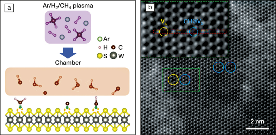 (a) A schematic illustration of the plasma-enhanced chemical vapor deposition system. (b) Aberration-corrected scanning transmission electron microscope image showing one sulfur vacancy (yellow circle) and three CH-doped sites (blue circles). Credit: Science Advances.