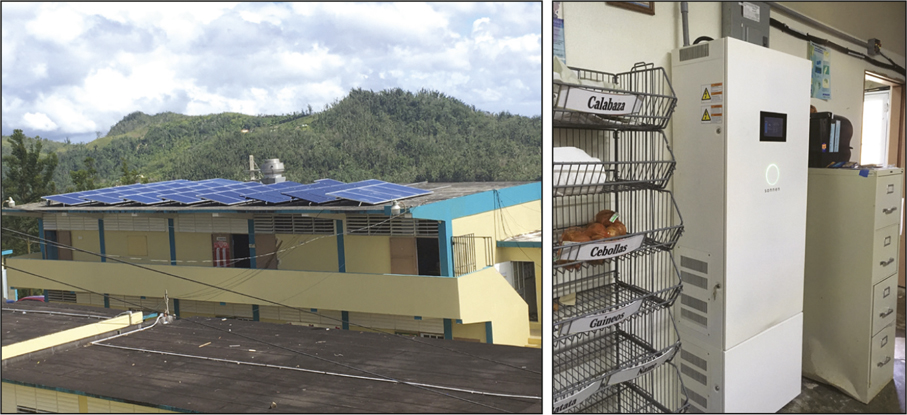 A rooftop solar-panel system (left) and one of two sonnen batteries (right) installed after Hurricane Maria at S.U. Matrullas, a K–9 school that educates more than 150 students in the remote town of Orocovis, Puerto Rico. Photo credits: sonnen GmbH.