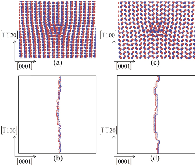Figure 4 - (a) The core structure of a $\left( {\bar 1\bar 120} \right)\left[ {0001} \right]$ c-type dislocation, (b) the same dislocation looking down on the glide plane, with crystallographic directions as indicated. (c) and (d) are the same for a $\left( {\bar 1100} \right)\left[ {0001} \right]$ c-type dislocation.