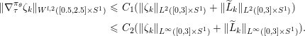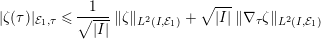 $$\begin{eqnarray}\displaystyle \int _{\unicode[STIX]{x1D70F}_{0}}^{\unicode[STIX]{x1D70F}}|\unicode[STIX]{x1D6FB}_{s}\unicode[STIX]{x1D701}(s)|_{{\mathcal{E}}_{1},\unicode[STIX]{x1D70F}}\,ds & {\leqslant} & \displaystyle \sqrt{|I|}\sqrt{\int _{\unicode[STIX]{x1D70F}_{0}}^{\unicode[STIX]{x1D70F}}|\unicode[STIX]{x1D6FB}_{s}\unicode[STIX]{x1D701}(s)|_{{\mathcal{E}}_{1},\unicode[STIX]{x1D70F}}^{2}\,ds}\nonumber\\ \displaystyle & {\leqslant} & \displaystyle \sqrt{|I|}\sqrt{\int _{I}|\unicode[STIX]{x1D6FB}_{s}\unicode[STIX]{x1D701}(s)|_{{\mathcal{E}}_{1},\unicode[STIX]{x1D70F}}^{2}\,ds}\leqslant \sqrt{|I|}\,\Vert \unicode[STIX]{x1D6FB}_{\unicode[STIX]{x1D70F}}\unicode[STIX]{x1D701}\Vert _{L^{2}(I,{\mathcal{E}}_{1})}\nonumber\end{eqnarray}$$