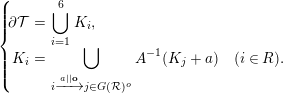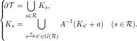 (2.1) $$\begin{eqnarray}\left\{\!\begin{array}{@{}rcl@{}}\unicode[STIX]{x2202}{\mathcal{T}}\ & =\ & \displaystyle \mathop{\bigcup }_{s\in {\mathcal{R}}}K_{s},\\ K_{s}\ & =\ & \displaystyle \mathop{\bigcup }_{s\xrightarrow[{}]{a}s^{\prime }\in G({\mathcal{R}})}A^{-1}(K_{s^{\prime }}+a)\quad (s\in {\mathcal{R}}).\end{array}\right.\end{eqnarray}$$
