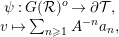 $$\begin{eqnarray}\begin{array}{@{}c@{}}\unicode[STIX]{x1D713}:G({\mathcal{R}})^{o}\rightarrow \unicode[STIX]{x2202}{\mathcal{T}},\\ v\mapsto \mathop{\sum }_{n\geqslant 1}A^{-n}a_{n},\end{array}\end{eqnarray}$$